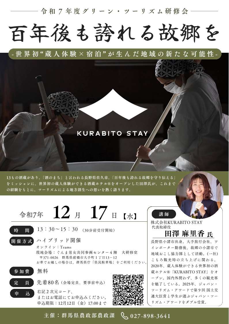 群馬県では、グリーン・ツーリズムや農泊の推進に向け、先進的な取組事例を紹介する「令和7年度グリーン・ツーリズム研修会」を開催します。