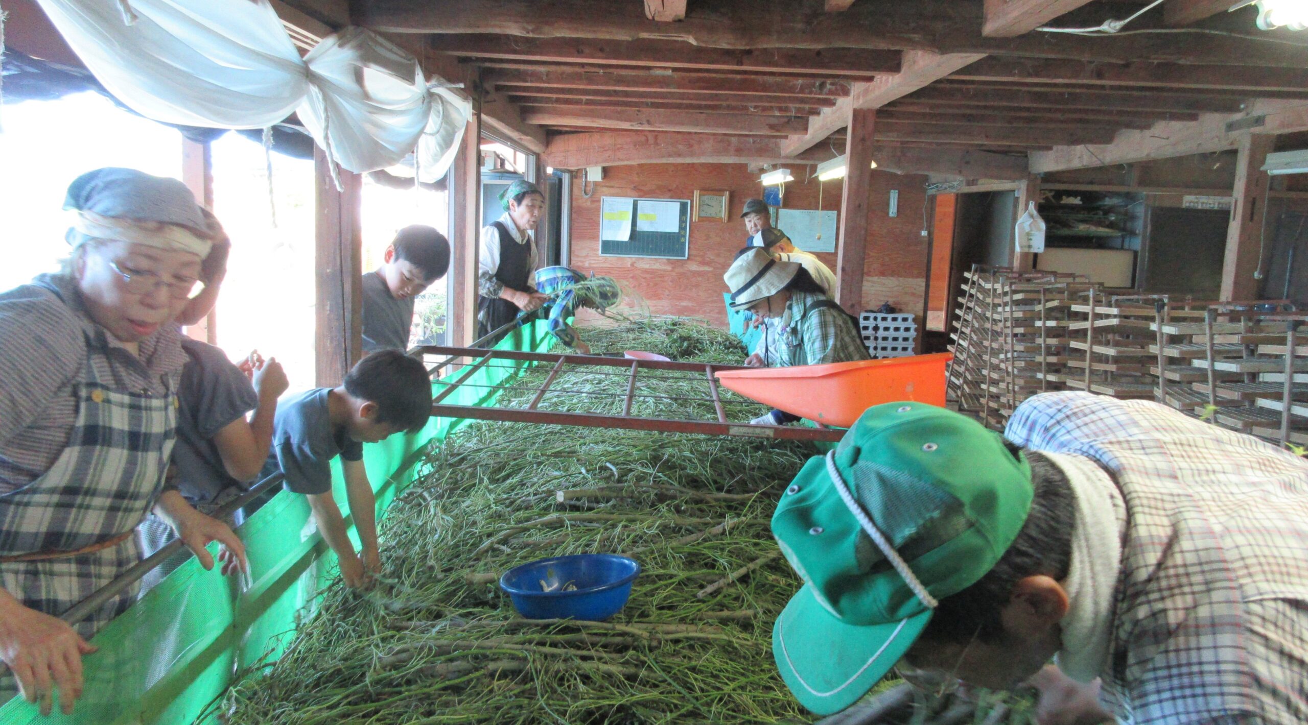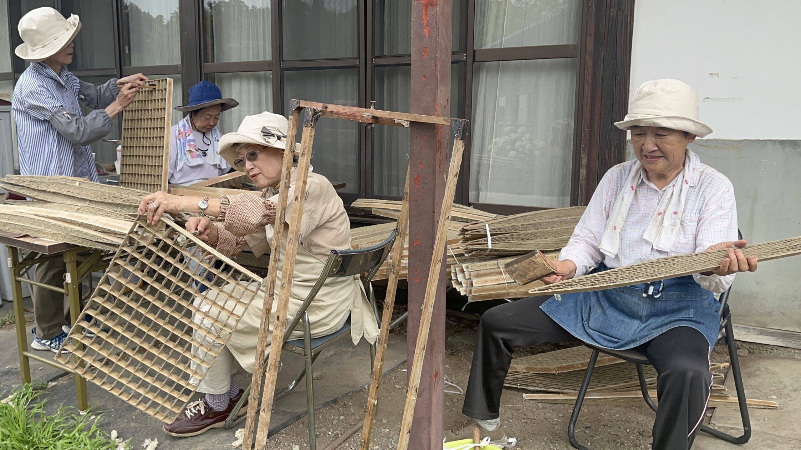 取材日には、ふれあいパーク岡成で活動する会員の女性たちが、夏蚕の準備として、回転まぶし*の掃除や組み立てを行っていました。お話を聞くと、養蚕は経験したことのない方がほとんどだそうです。「楽しみながら活動している。(何度も養蚕に関わっていると)蚕がかわいく思えてきますしね。」と話していました。